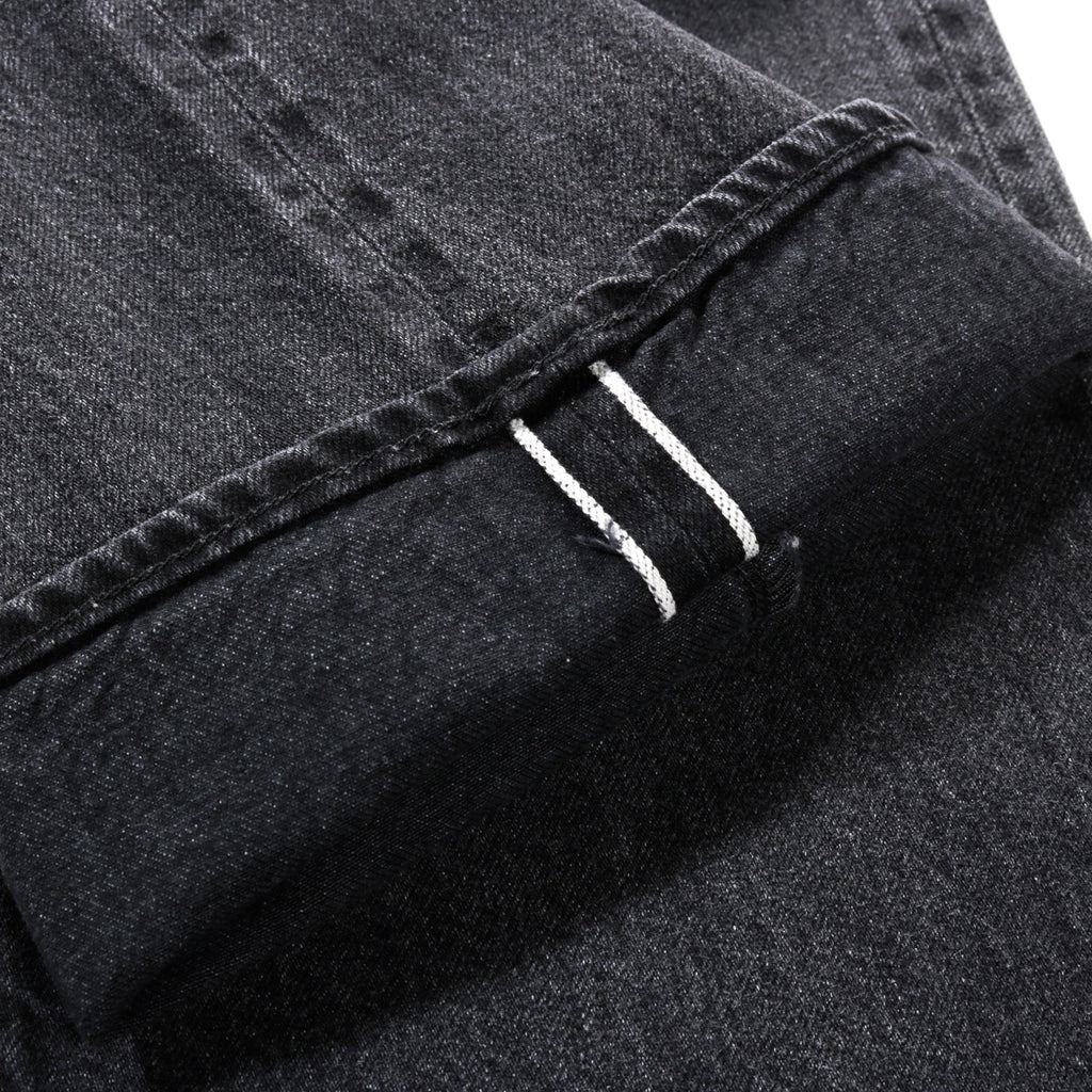 THE FABRIC IS ORIGINAL WHITE EDGE 12OZ SELVEDGE DENIM, A MATERIAL THAT CAN BE WORN YEAR-ROUND AND IS ALSO USED IN PHIGVEL'S STANDARD DENIM SERIES. THE ITEM HAS A STRAIGHT SILHOUETTE THAT FALLS STRAIGHT FROM THE KNEE TO THE HEM.
