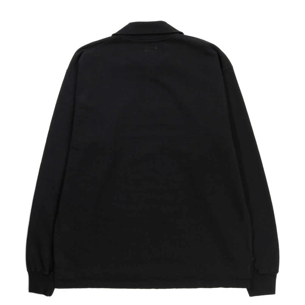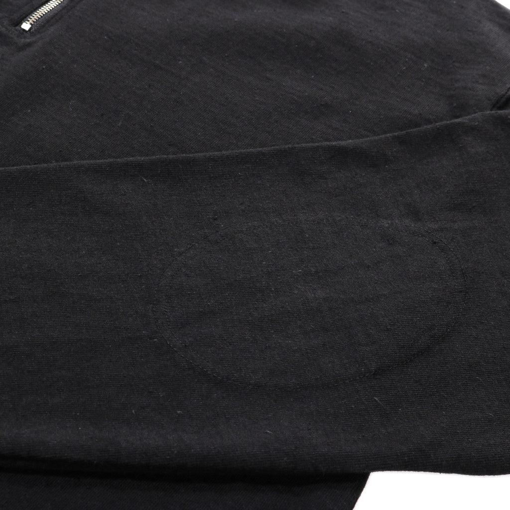 This heavy jersey fabric is knitted using an original mix of straight and nep yarns. A half-zip long-sleeve T-shirt with elbow patches and shoulder line that is dropped to the back.