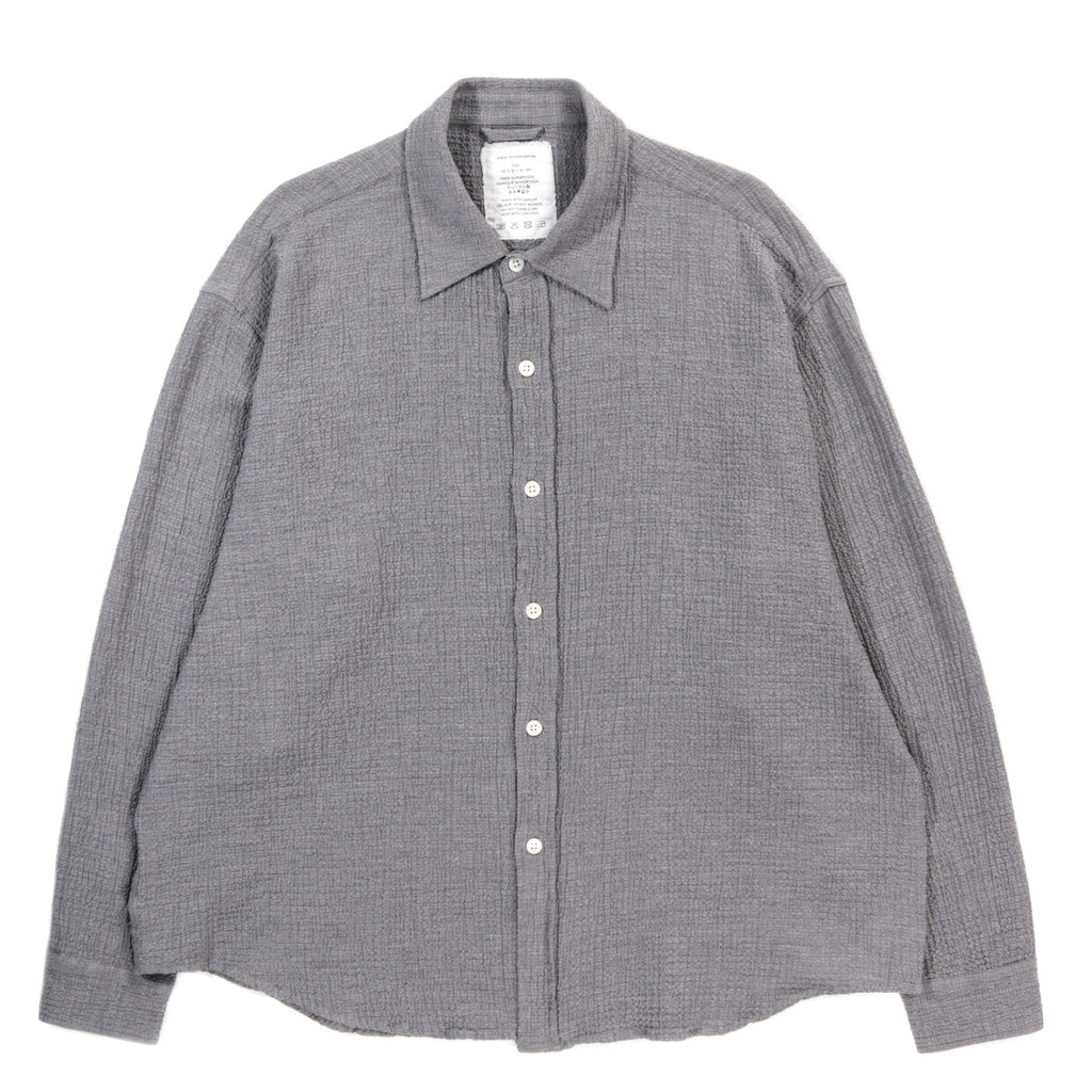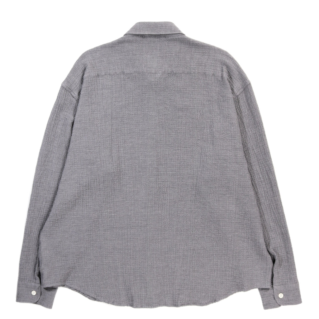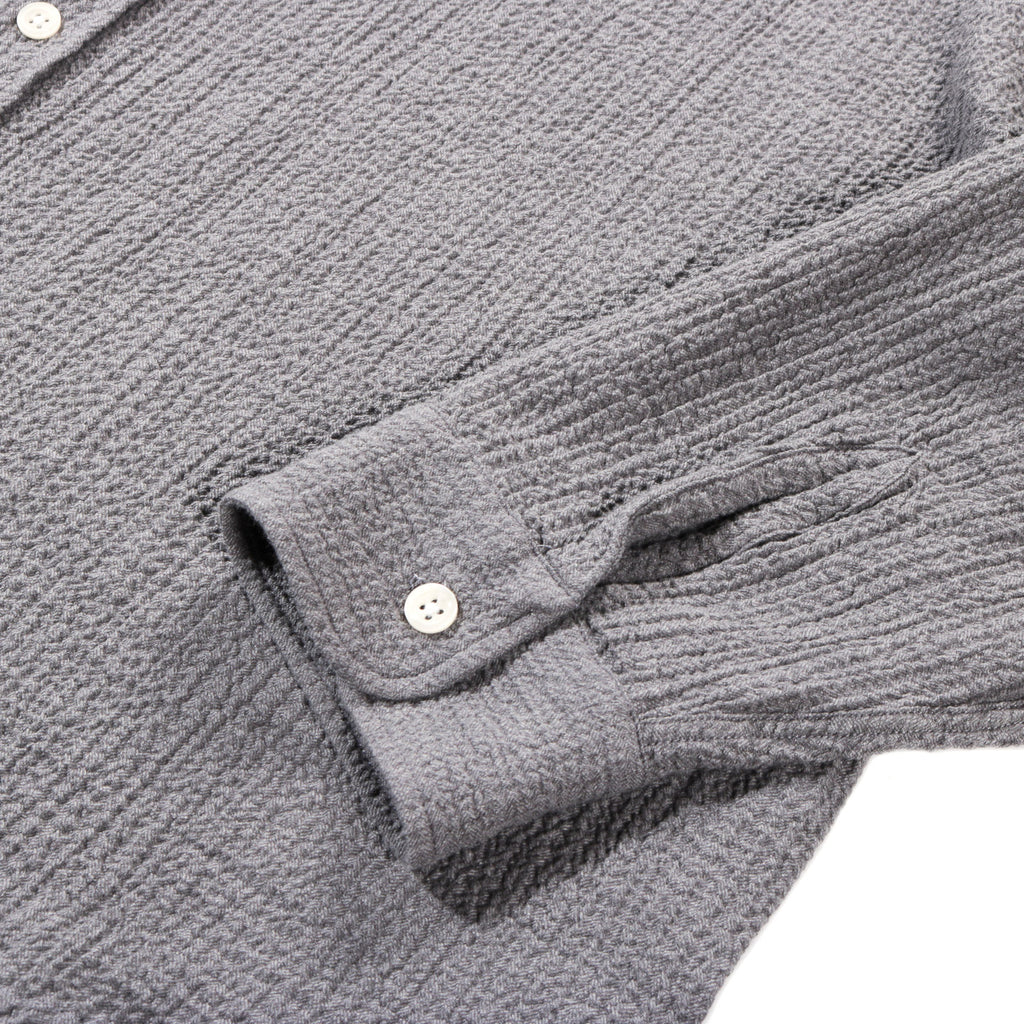 The Vacation Shirt has a loose boxy fit with drop shoulders and a curved hem. Featuring spread collar and button placket. Cut from a soft seersucker fabric with a blend of cotton and cashmere, in a speckled mid grey.