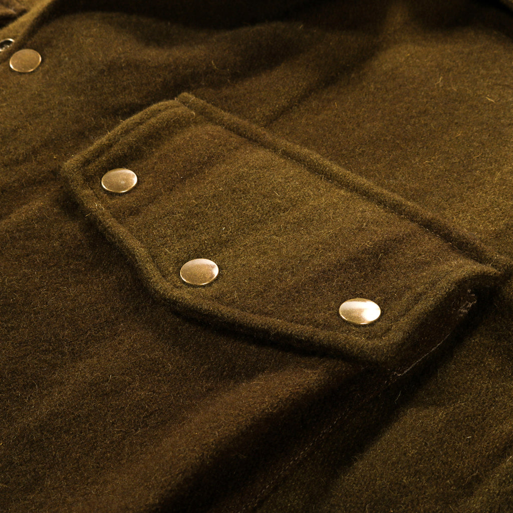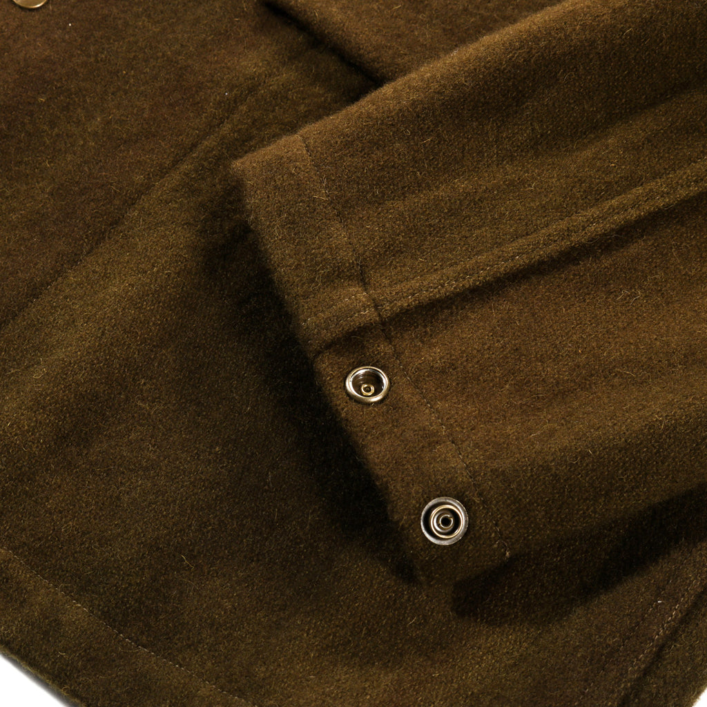 - MID WEIGHT MELTON WOOL FABRIC WITH UNEVEN DYE- UNLINED- RELAXED, BOXY FIT- ADJUSTABLE SNAP CUFFS- SNAP FRONT- 100% WOOL- MADE IN JAPAN