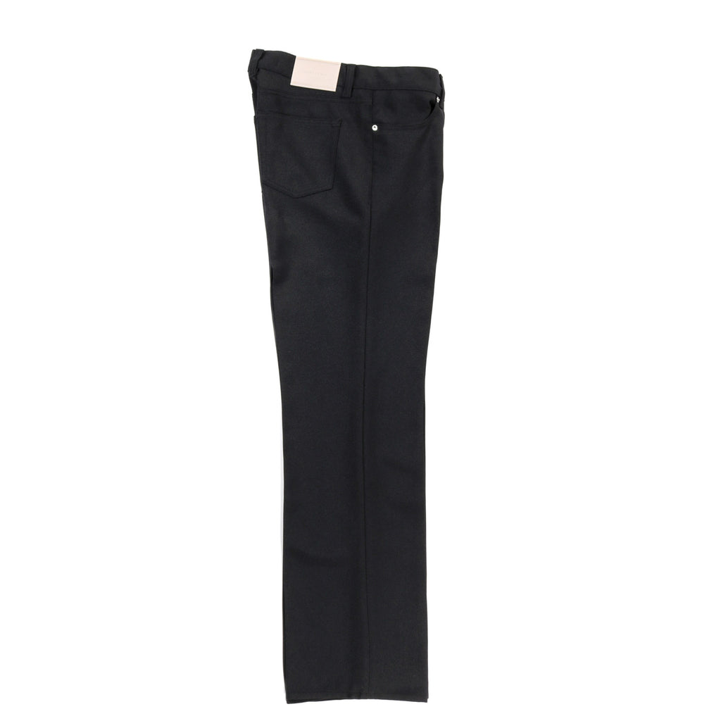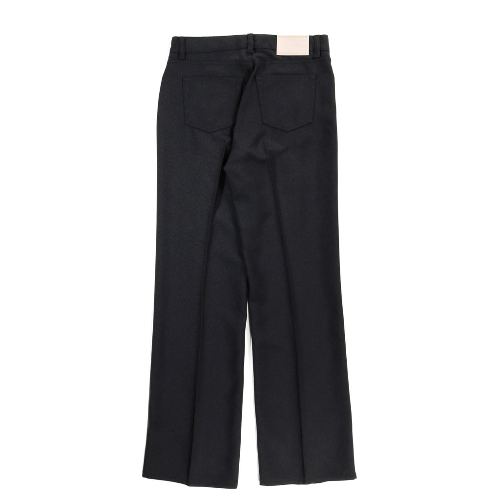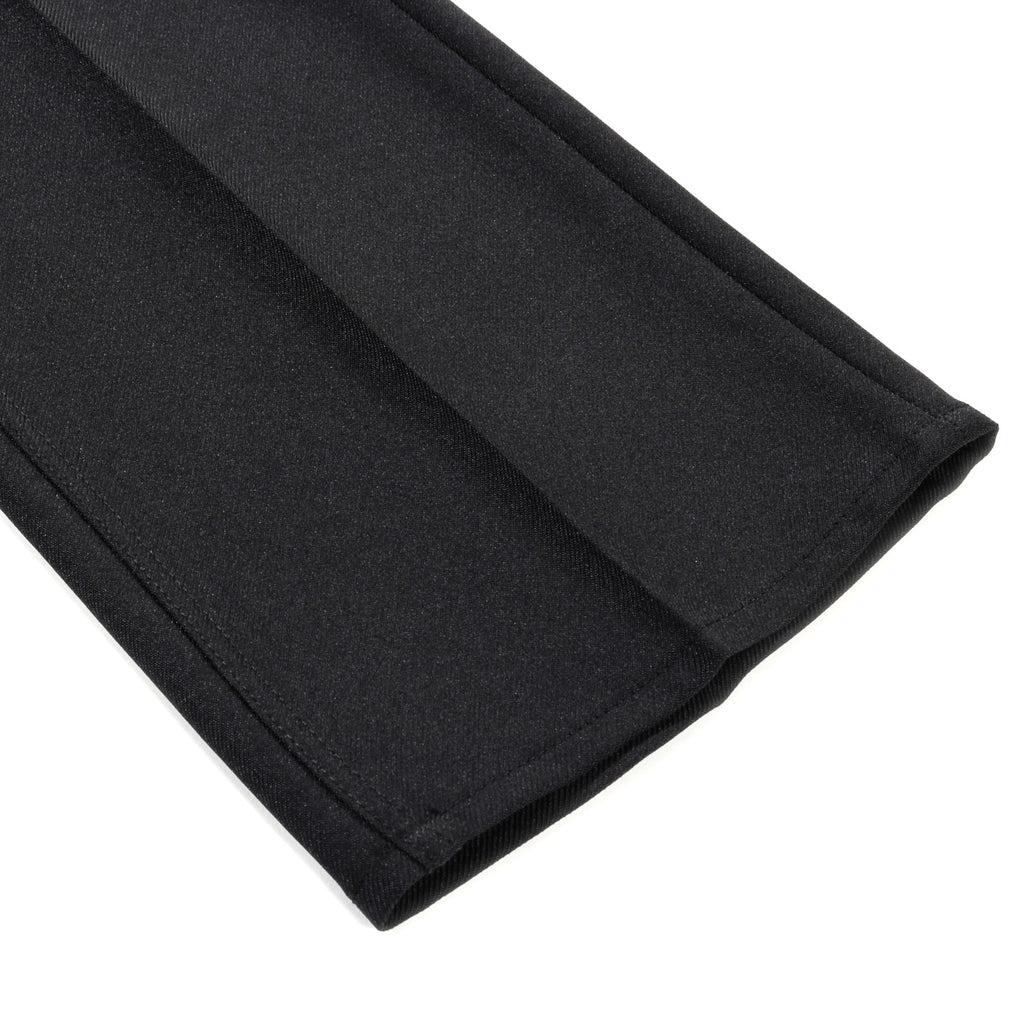 Our Legacy Carlson Cut in Black Permanent Crease. Produced in Japanese polyester fabric, the Carlson Cut has a high waist with straight hip and slight boot cut and features permanent creases, a zip fly, steel rivets, and five pockets.