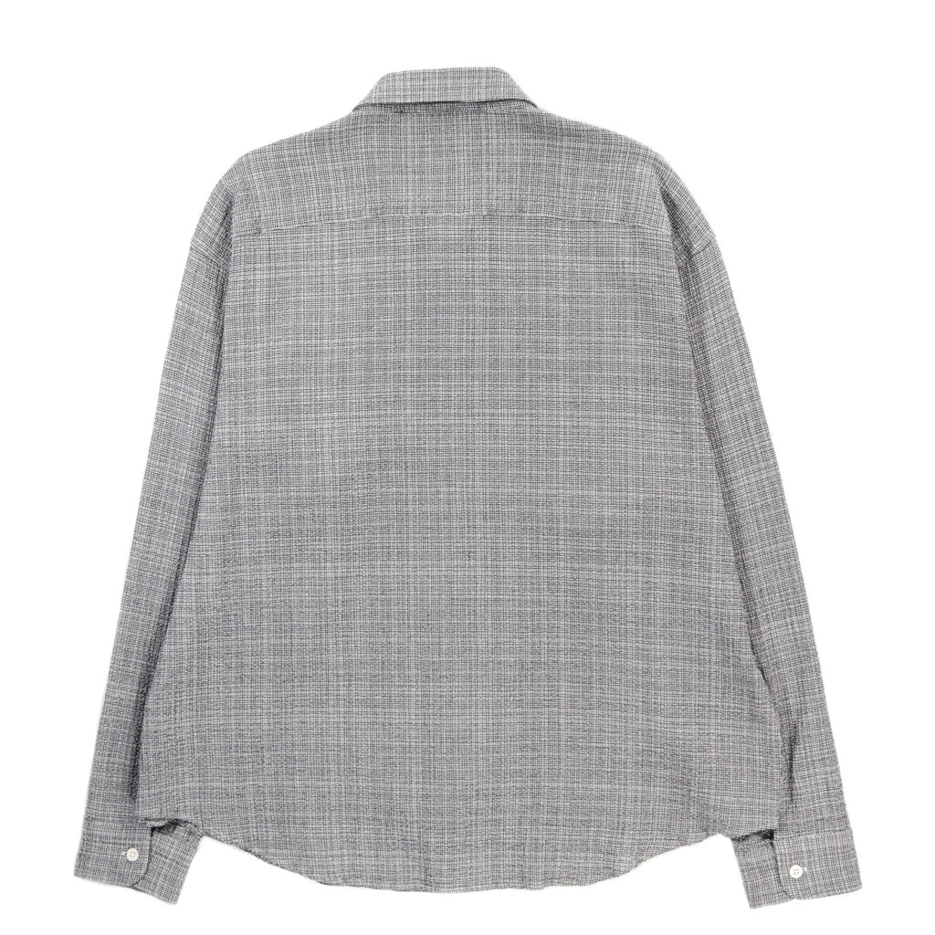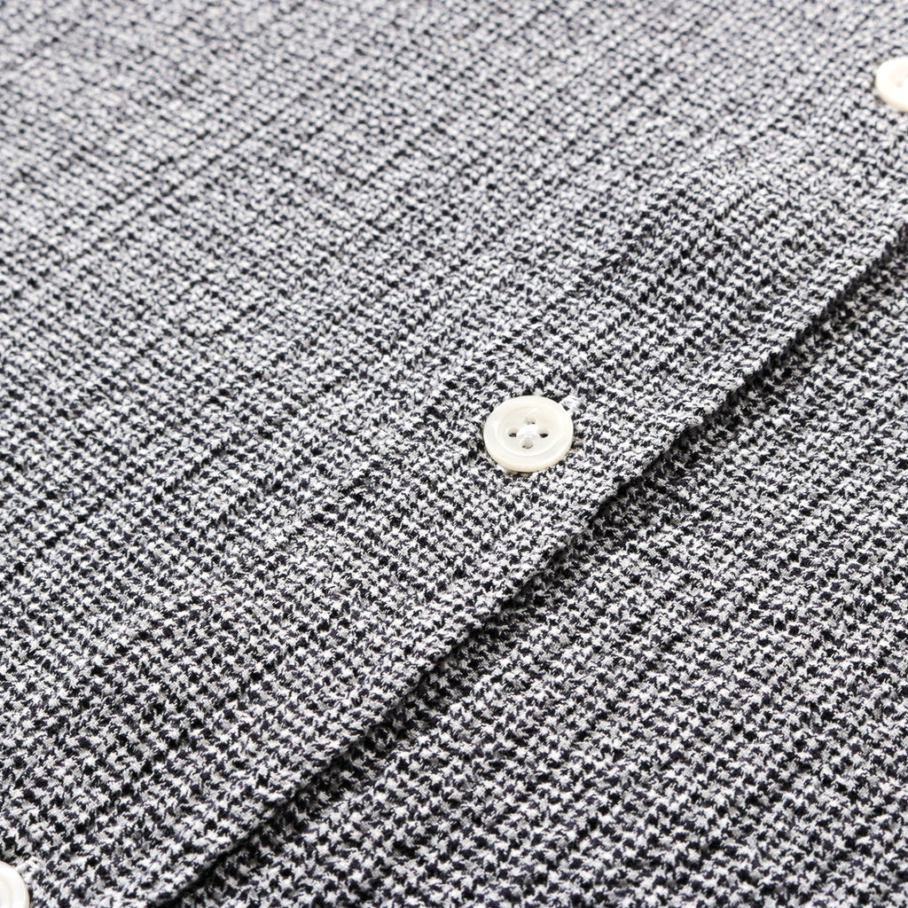 The Vacation Shirt has a loose boxy fit with drop shoulders and a curved hem. Featuring spread collar and button placket. Cut from a lightweight seersucker cotton blend in a black mini houndstooth check on a white ground.