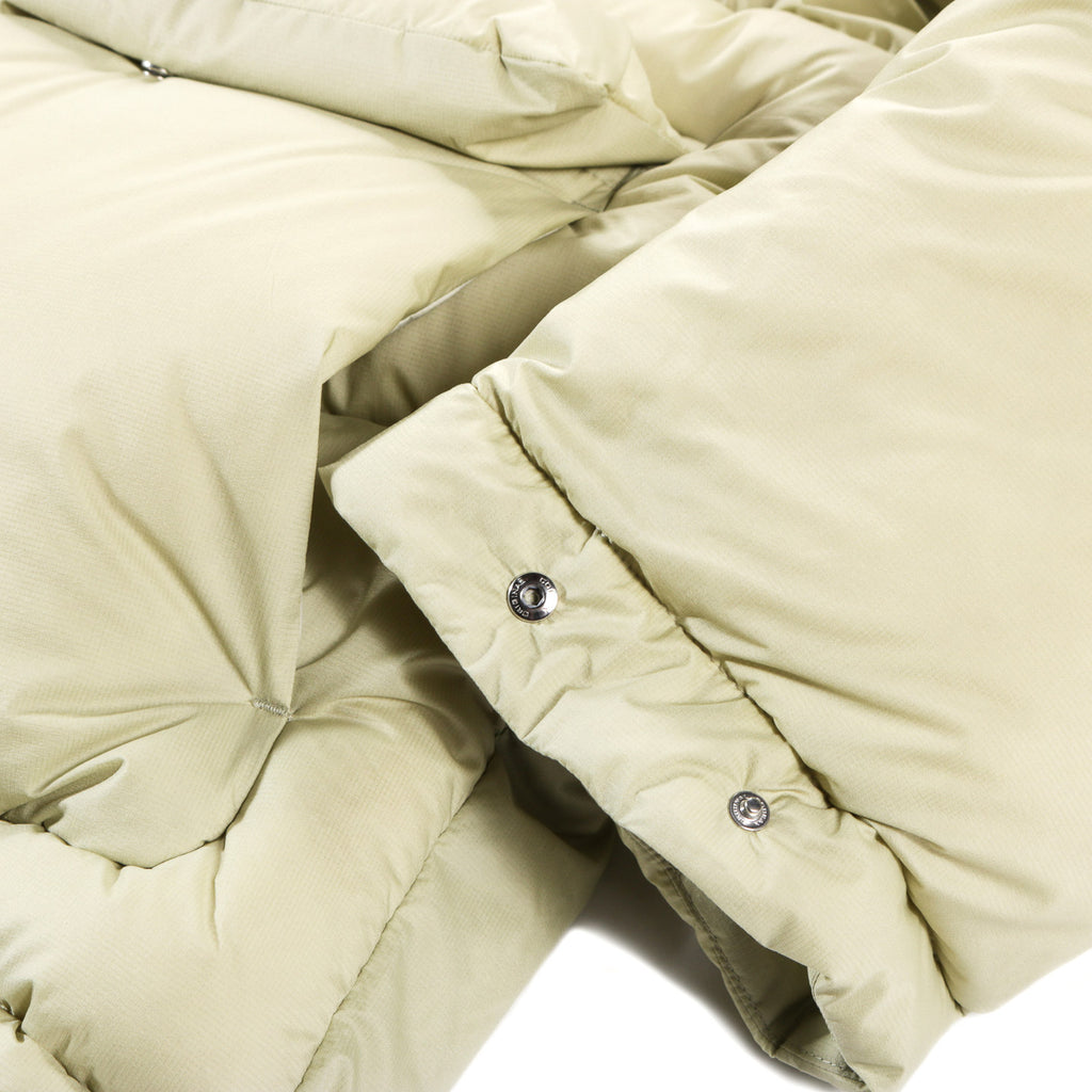 Mini ripstop fabric, which features an ultra-lightweight and extremely thin and light touch with 15d superfine nylon wooly yarn. The fabric incorporates a special urethane coating on the reverse side, providing both wind resistance and water repellency, making it exceptionally functional. For insulation, it utilizes White Duck Down sourced from the UK. Prior to filling the product, it undergoes additional humidification and drying processes, resulting in a light and fluffy finish. This material, known for its voluminous yet lightweight characteristics, ensures warmth and functionality.