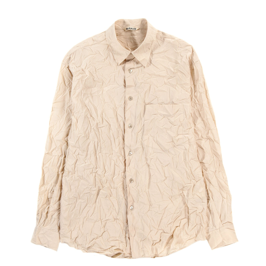 Auralee takes their classic standard shirting material of Egyptian Finx Twill cotton and adds a unique twist. Each piece is meticulously treated with a wrinkle process and woven at high density before undergoing a washing treatment. The fabric retains its smooth and silky touch while showcasing a unique textured appearance with distinctive wrinkles.