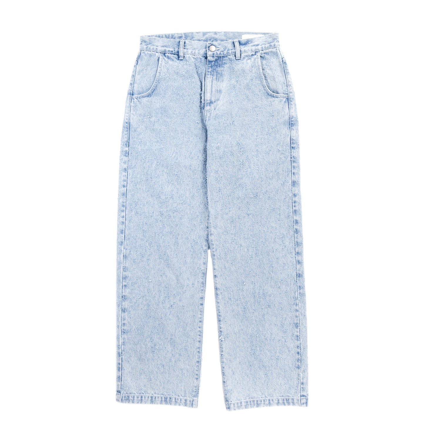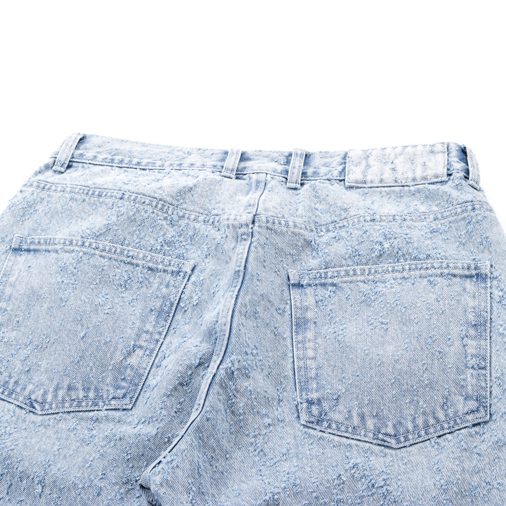 The Straight Cut Jeans have a relaxed straight fit with a mid-rise. Made with side pockets, rear patch pockets, metal button closure and YKK zip fly. Cut from an organic cotton denim in light blue, with an all-over distressed pattern made with a laser.