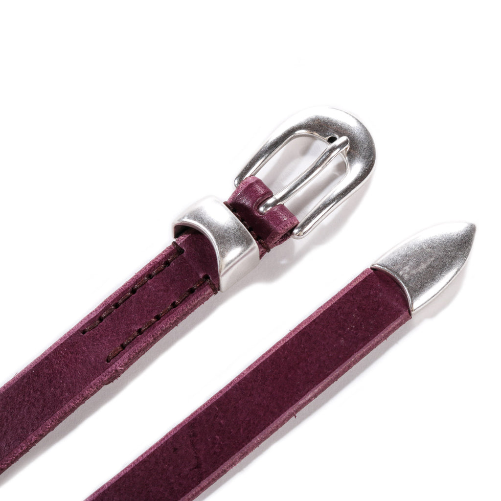 OUR LEGACY BELT 2 CM IN SHADOW BERRY LEATHER. THE BELT IS 2 CM WIDE AND FEATURES A METAL PIN BUCKLE CLOSURE, A METAL KEEPER, A METAL TIP AND A DUST BAG COVER.  THE BELT HAS A WIDTH OF 2 CM AND MEASURES 80 CM, 90 CM OR 100 CM FROM THE END TO THE MIDDLE BELT HOLE - EXCLUDING THE BUCKLE.