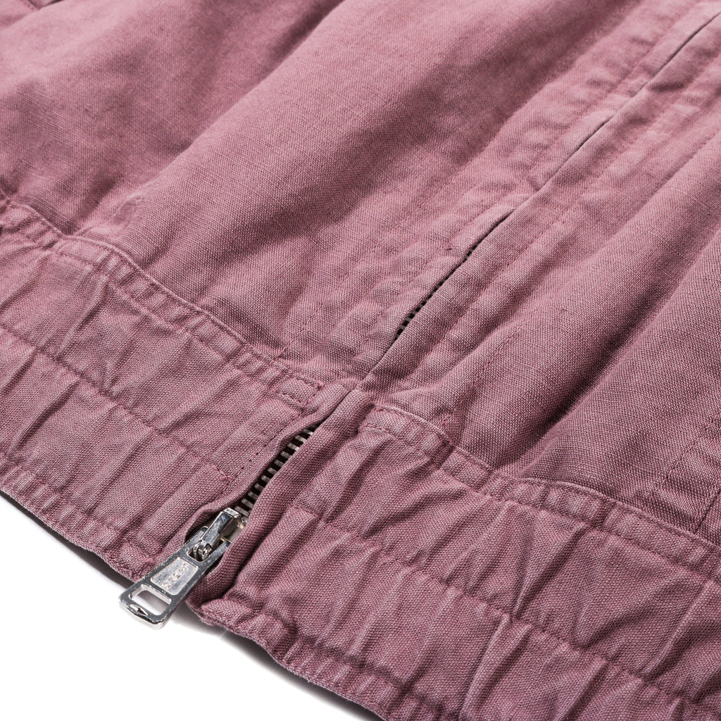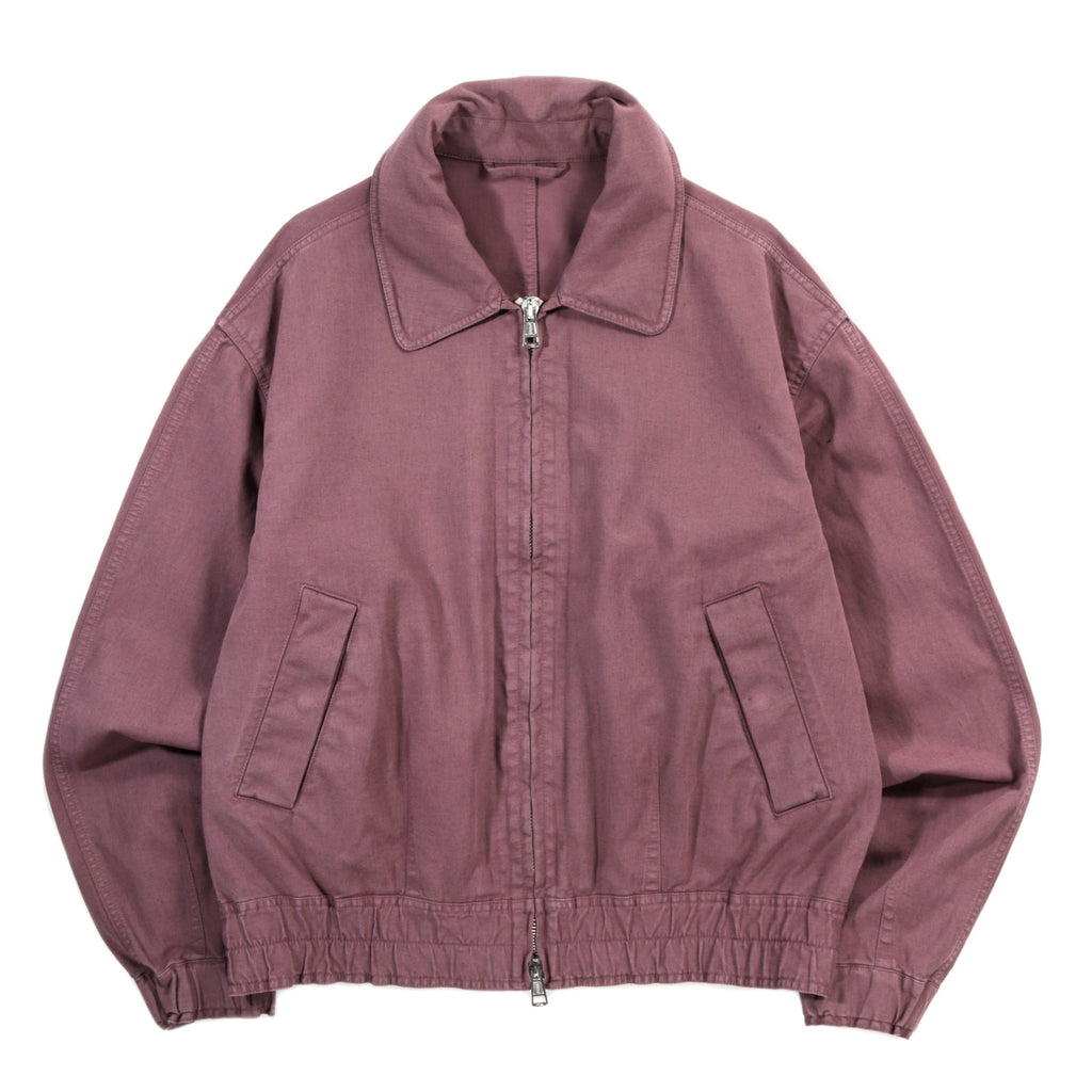 Our Legacy Command Jacket in Port Soft Coat. Produced in a piece dyed cotton, linen and polyurethane blend fabric, the Command Jacket is built on a bomber silhouette with a short body, darted details and elasticated cuffs and hem. It features a rounded collar with an under-collar zip that conceals a contrast fabric hood, a front zipper hidden by a grown-on bumper, and a double zip guard that snaps together to allow the jacket to be worn closed without fastening the zip for a layered look. Additional details include frogmouth welt pockets with snaps and stitched-through darts running into the elasticated hem and cuffs.