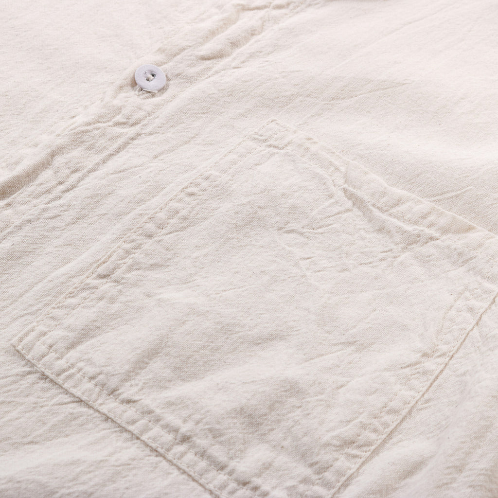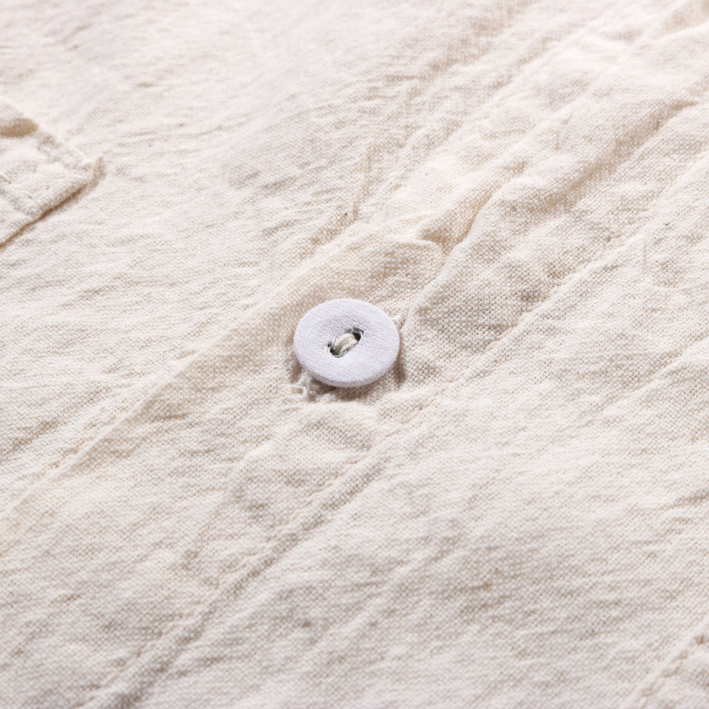 Cotton Pyjama is woven in USA from American cotton and was designed for flan- nel-raising to become pyjamas fabric.Tender shirts, however, are made from the raw cotton fabric, straight off the loom.The patterns are cut extremely oversized, from the heavily starched cloth, but shrink down to a very soft, correctly sized garment during washing and dyeing.This shrinkage and textural change would normally happen during the flannel finishing process, but in the case of these shirts it happens on the garment itself, bringing the panels together and creating something more than the sum of its parts.