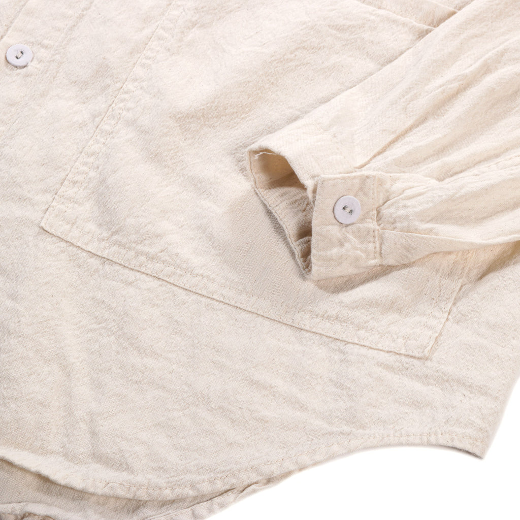 The Frock Shirt is a combination of a three-pocket work shirt and a tailored frock coat. The fabric is cut across the grain, with no side seams, and the shoulder seam is sloped back from the centre of the neck to the back of the armhole, connecting with the sleeve seam which runs along the back of the sleeve to the cuff.This way of cutting recalls 18th and 19th Century dress coats, where the sloped shoulder seam keeps the garment cleaner from the front, and the slight bias allows the fabric to be stretched in over the canvasses.